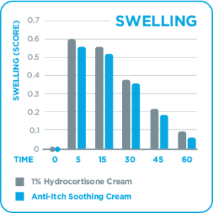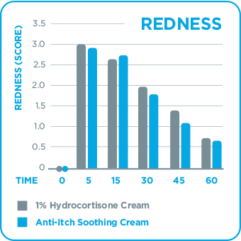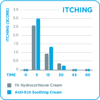 Over a 60 minute period at different time points, subjects in a clinical trial applied both Anti-Itch Soothing Cream and Steroid Cream in different site areas, to measure at different intervals the reduction in itching, redness and swelling.